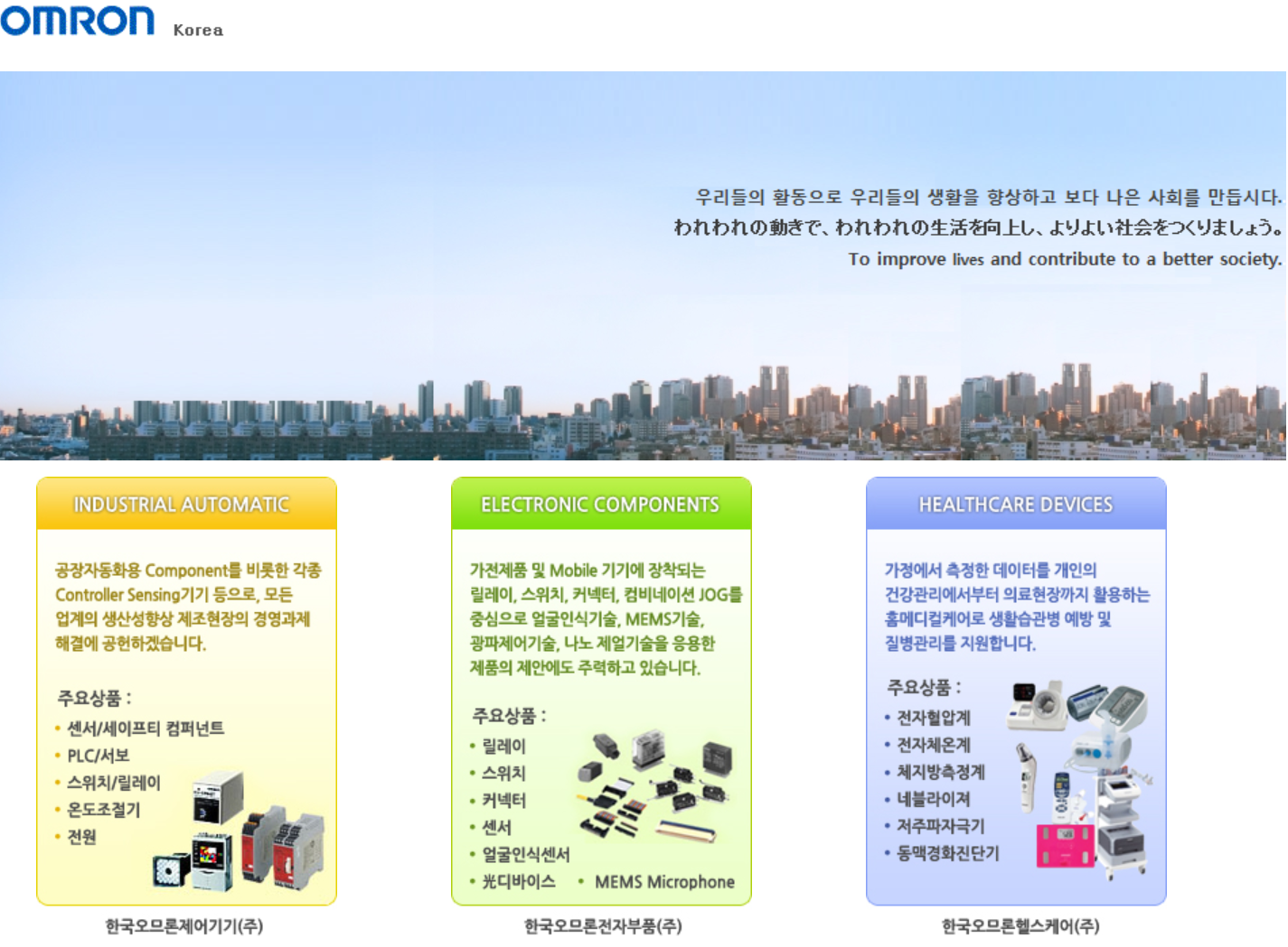 한국에는 제어기기/전자부품/헬스케어 세 부문으로 진출해있습니다.